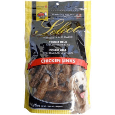 Barnsdale Farms Select Chicken Links for Dogs are made out of all-natural chicken, ground oat groats, beets, parsley and garlic. With a crunchy texture your dog will love, this treat is low in fat and high in flavour!