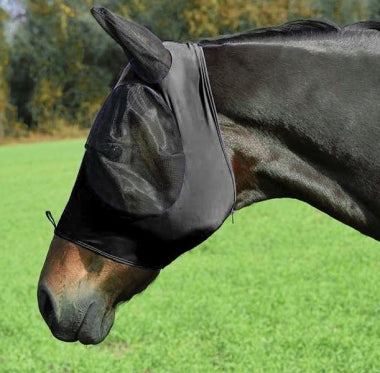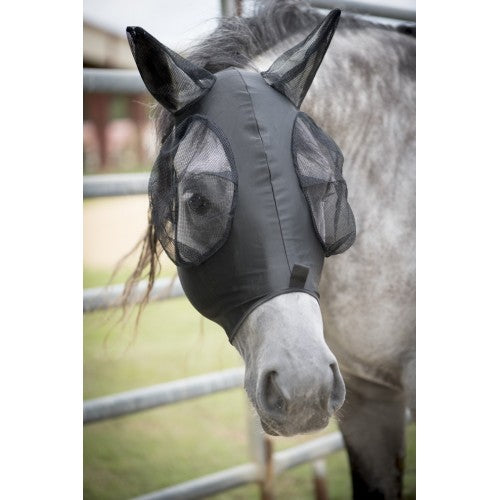 The Equi-Sky Lycra Fly Mask With Ears features a soft, stretchy, Lycra material for unbeatable comfort! It has mesh eyes for maximum visibility and protection and mesh ear openings to provide ventilation and protection. Durable stitching around the edges and a tab at nose makes for easy removal. Also features a zipper under the chin for better fit and makes this mask easy to put on and take off.