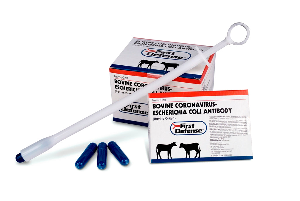 Prepared from hyperimmune bovine colostrum, First Defense is a bolus which dissolves readily upon reaching the calf's stomach, providing guaranteed levels of K99+E. coli and coronavirus antibodies to reduce scours related morbidity and mortality. Administer in the first 12 hours after birth. Keep below 23°C - product not harmed by freezing.