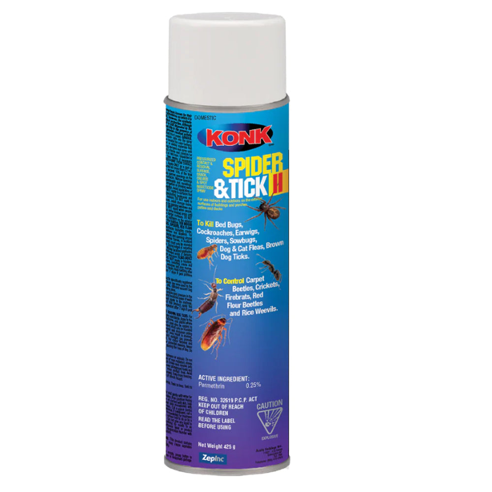 KONK Spider & Tick II. Pressurized contact & residual surface, crack, crevice & spot insecticide spray. Kills ants, bed bugs, cockroaches, earwigs, spiders, sow bugs, silverfish, dog and cat fleas, brown dog ticks, house flies, exposed thrips, leaf-hoppers, aphids and leaf eating caterpillars. To control carpet beetles, clothes moths, crickets, firebrats, red flour beetles and rice weevils.