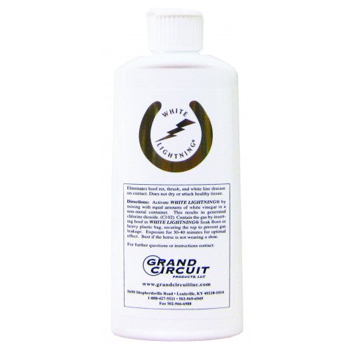 White Lightning is a solution which has the ability, when mixed with equal parts of white vinegar, to produce chlorine dioxide. Chlorine dioxide is very aggressive in neutralizing bacteria, fungus and yeast, and has been proven to be highly effective in the treatment of White Line Disease, Thrush, and Hoof Rot.